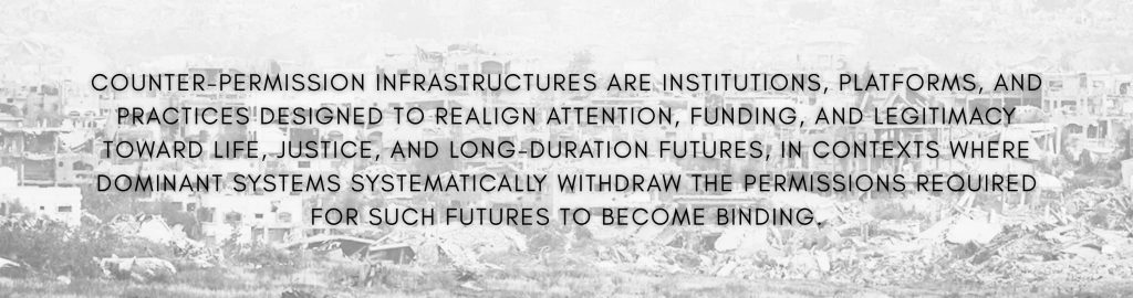 This is where the concept of counter-permission infrastructures becomes decisive. These are not “future labs” or innovation hubs designed to feed the existing system with novelty. They are infrastructures that refuse the dominant terms under which imagination is permitted to circulate. They re-route attention, legitimacy, and care away from extractive regimes and toward the work of sustaining life, justice, and long-duration futures.